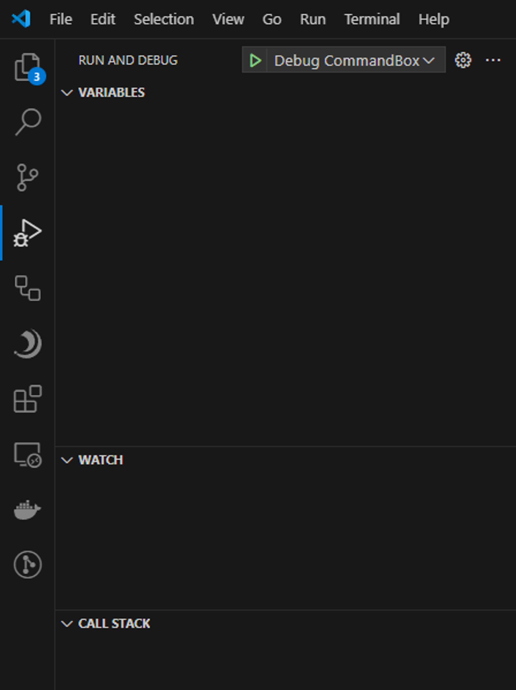 At this point your server is configured, it’s running, and you have just added a launch configuration. The next step is to run the debugger. All we need to do is open up the debug tab in our side-panel and select the correct configuration, which is the one we just added `Debug CommandBox`