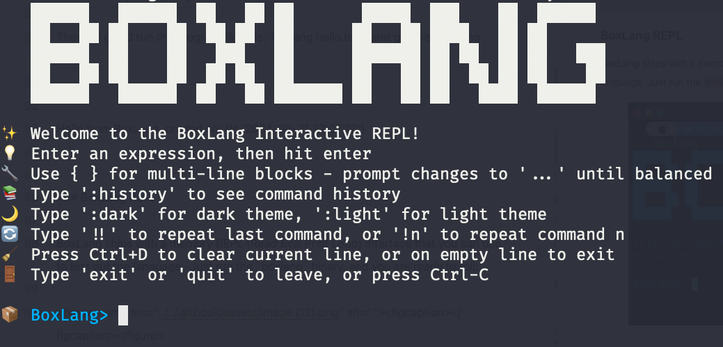 <figure><img src="https://1598982152-files.gitbook.io/~/files/v0/b/gitbook-x-prod.appspot.com/o/spaces%2F4ENvvb4b3Cmrr1qKj7y4%2Fuploads%2Fgit-blob-58562774b12ebd902ce3b9695df5e74a46d6bb91%2Fboxlang-repl.png?alt=media" alt=""><figcaption></figcaption></figure>